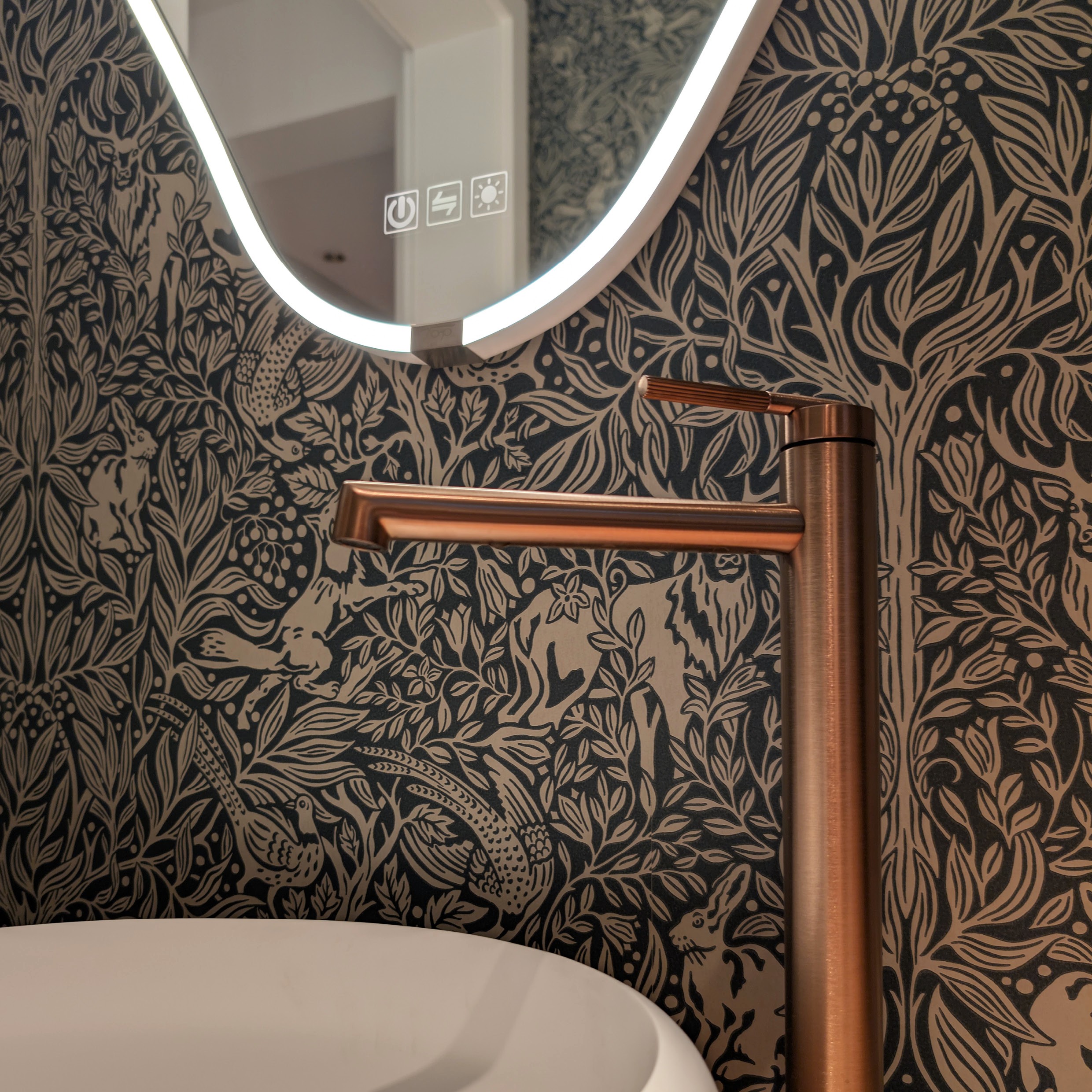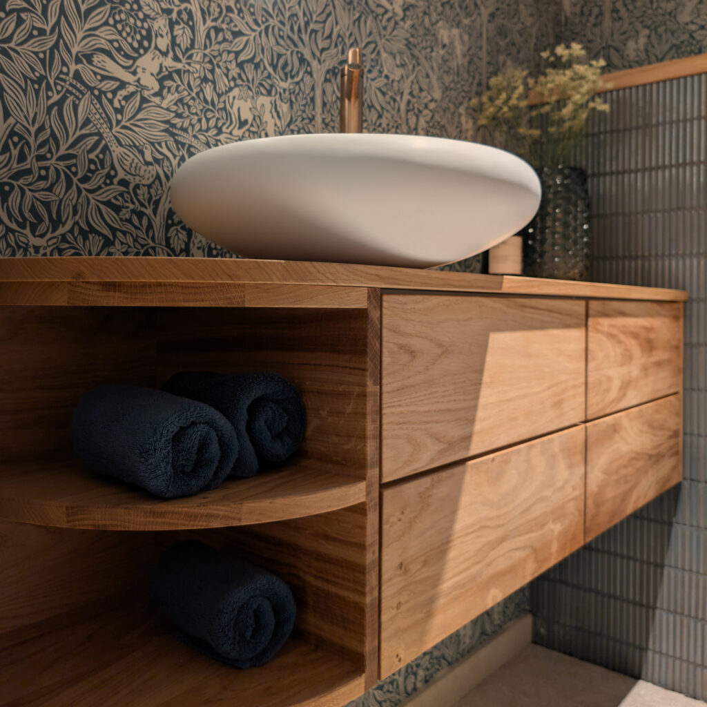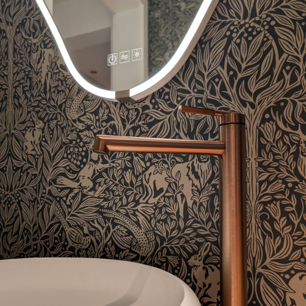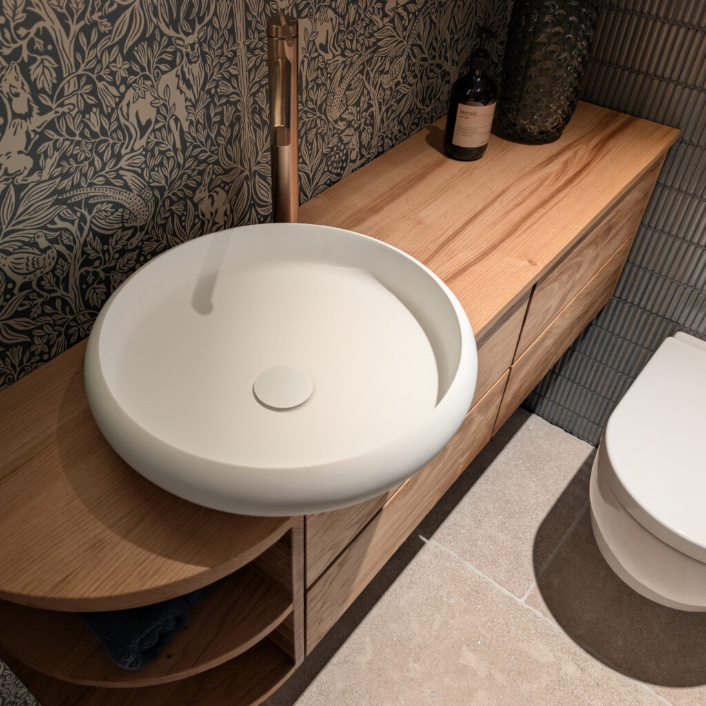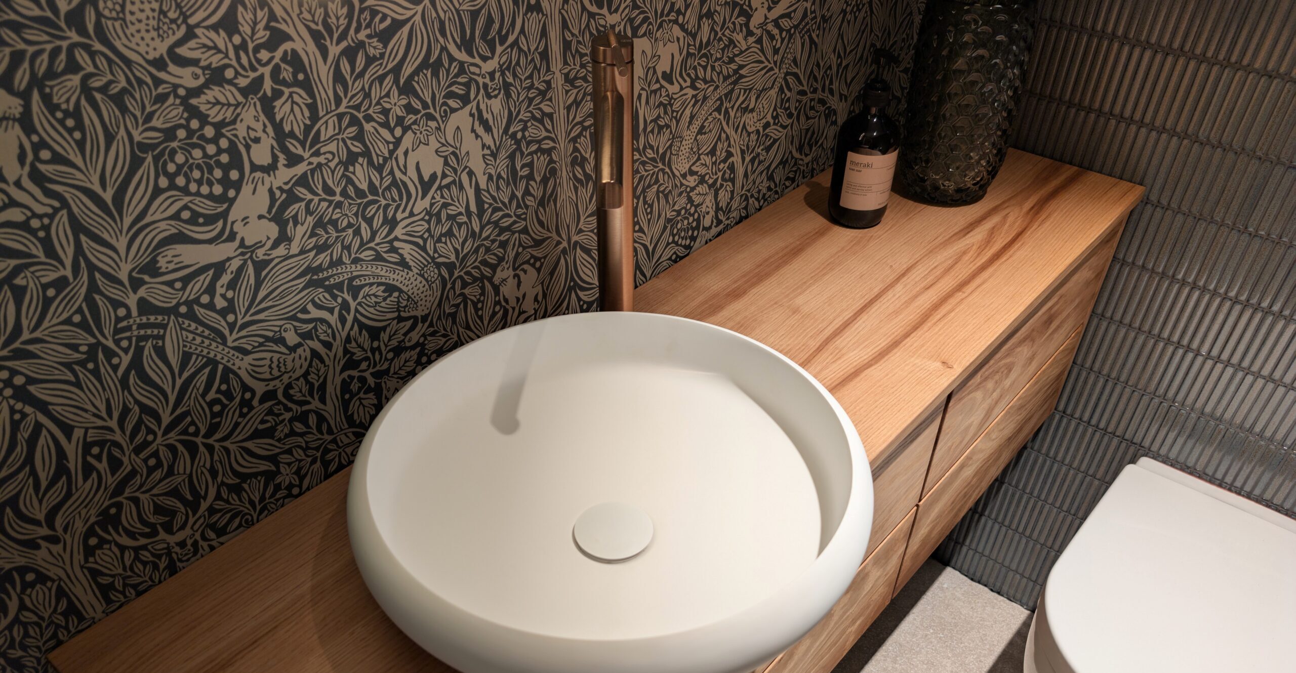 Ein durchdachtes Möbelstück mit besonderen Accessoires und clevere Beleuchtung sorgen für ein wunderbares Ambiente. So wird ein Gäste-WC zur Wohlfühloase.