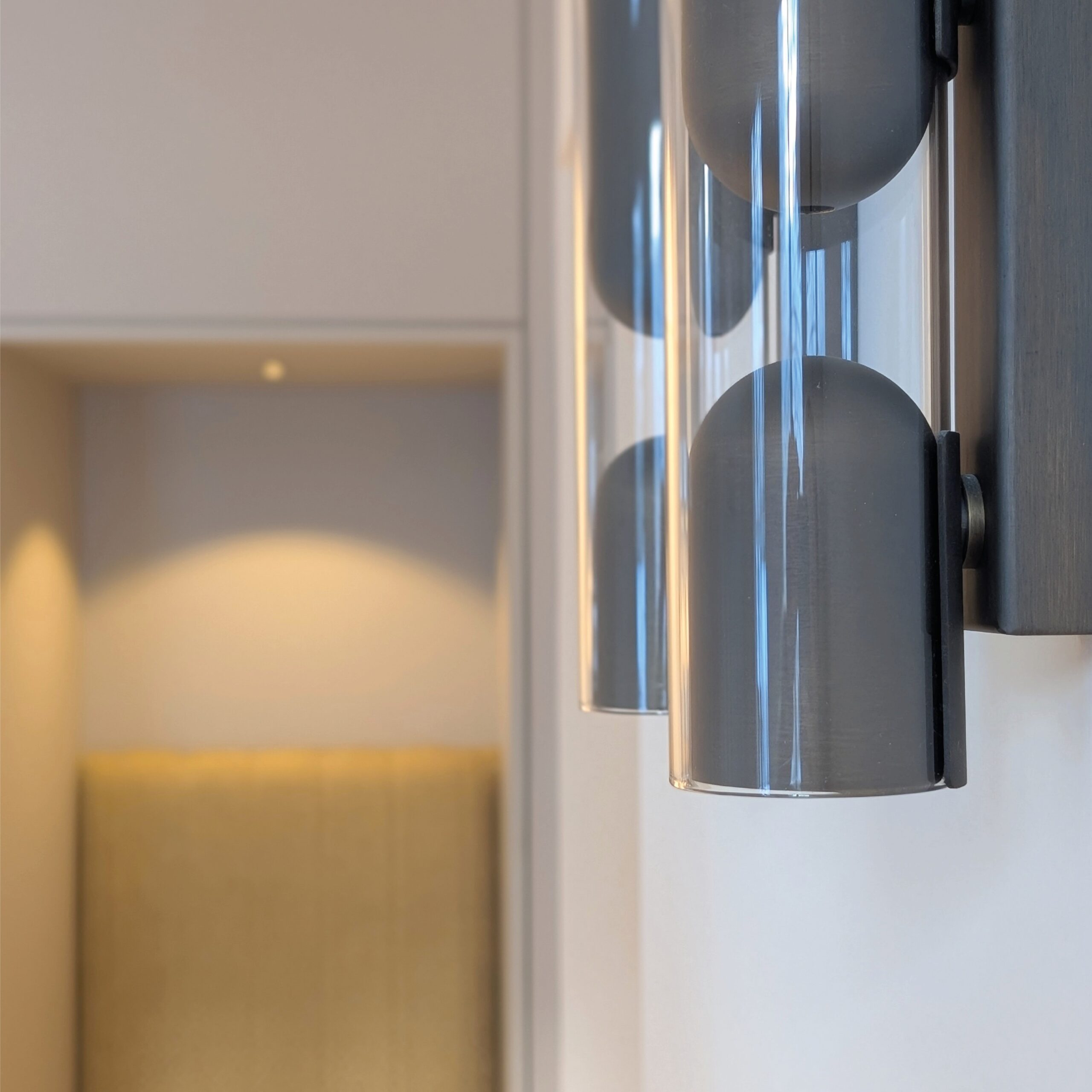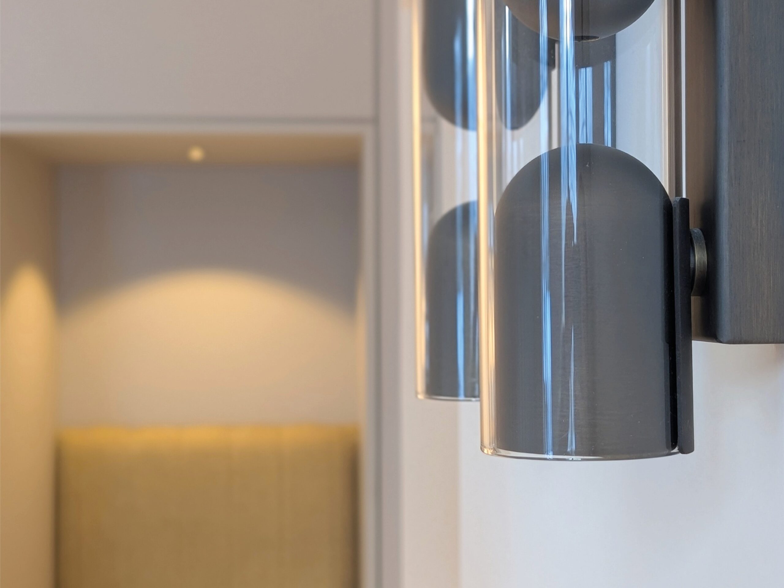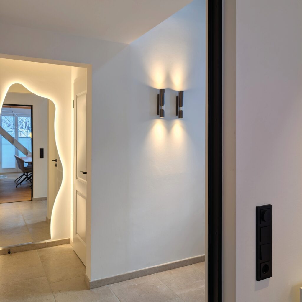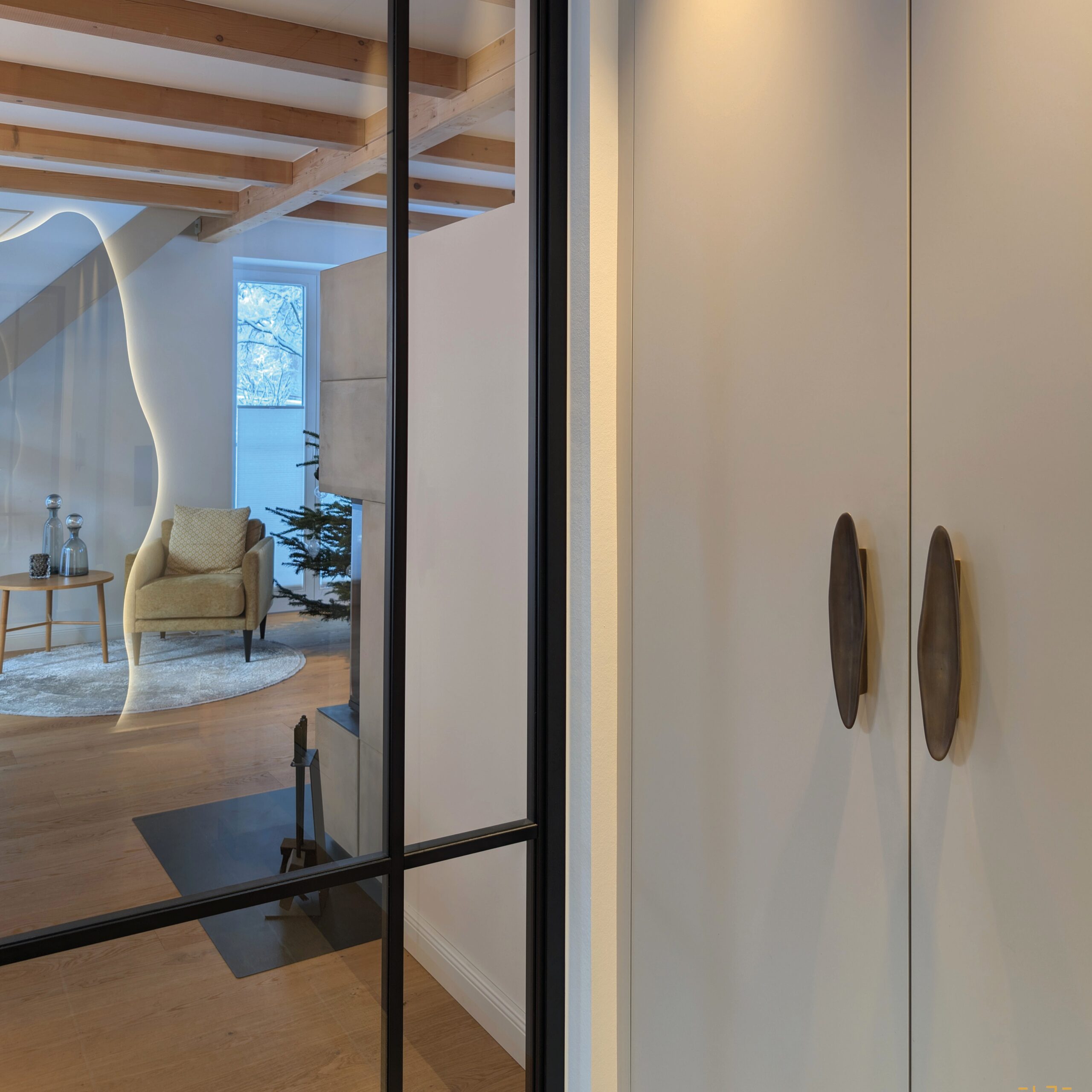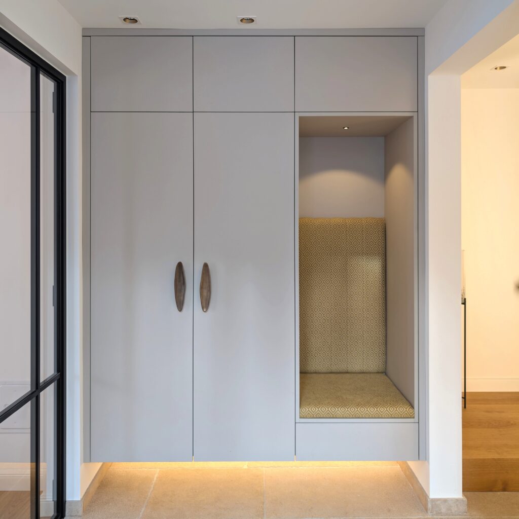 Die gezielt beleuchtete Sitzbank und indirekte Beleuchtung unter dem hängenden Schrank schafft Atmosphäre und Wärme. Im Gesamtbild mit dem organischen – indirekt beleuchteten – Spiegel und den bronzenen Wandleuchten ist der Eingangsbereich ein Traum.