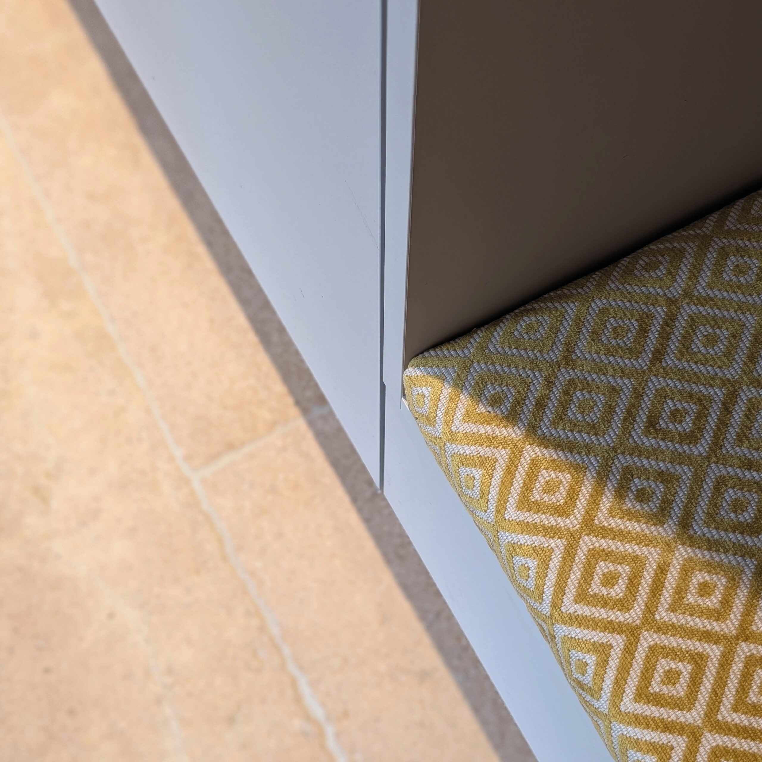 Der Natursteinboden aus harten Kalksandstein lädt zum Betreten ein. Die fein gehämmerte Oberfläche im warmen sandigen Farbton mit dem schönen Kantenspiel strahlt in Kombination mit den organischen Griffen eine natürliche Behaglichkeit aus.